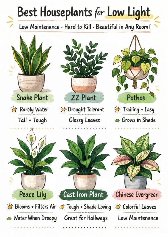 Start with one or two that fit your space and schedule. Snake plant for structure. Pothos for trailing greenery. ZZ plant for a glossy statement. Cast iron plant for truly dim areas.